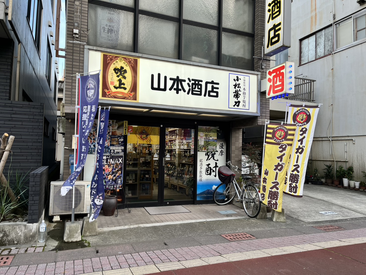 鹿児島中央駅から約1.3km、市電通りに面した間口約5m、阪神タイガースと鹿児島ユナイテッドFCののぼりがはためく酒屋です。間口は狭いですが、奥の倉庫まで含めると長さ50mあります。